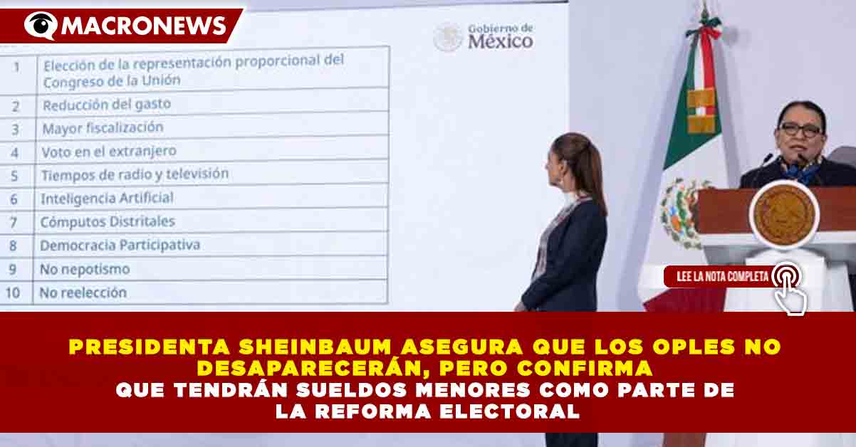 Redacción Macronews.- Durante La Mañanera del Pueblo, la presidenta Claudia Sheinbaum informó que la reforma electoral contempla mantener los 32 Organismos Públicos Locales Electorales (OPLES), aunque con estructuras más reducidas, salarios ajustados y sin duplicidad de funciones, con el objetivo de disminuir el gasto público en materia electoral.