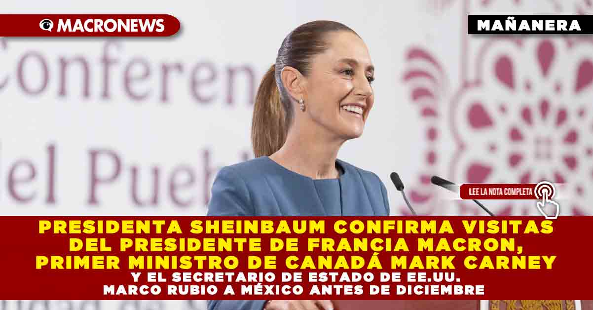 Redacción Macronews.- La presidenta de México, Claudia Sheinbaum Pardo, confirmó este miércoles una serie de visitas diplomáticas de alto nivel que tendrán lugar en los próximos meses, como parte de una estrategia para fortalecer los vínculos multilaterales del país ante los nuevos desafíos globales. Entre los líderes que arribarán a territorio mexicano se encuentran el presidente de Francia, Emmanuel Macron; el primer ministro de Canadá, Mark Carney; y el secretario de Estado de Estados Unidos, Marco Rubio.