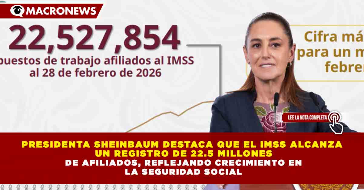 Redacción Macronews.- México alcanzó un récord de 22 millones 527 mil 854 empleos afiliados al IMSS al 28 de febrero de 2026, de los cuales 19 millones 696 mil 739, es decir, 87.4 por ciento, corresponden a empleos permanentes, informó la presidenta Claudia Sheinbaum Pardo durante la conferencia matutina de este lunes.