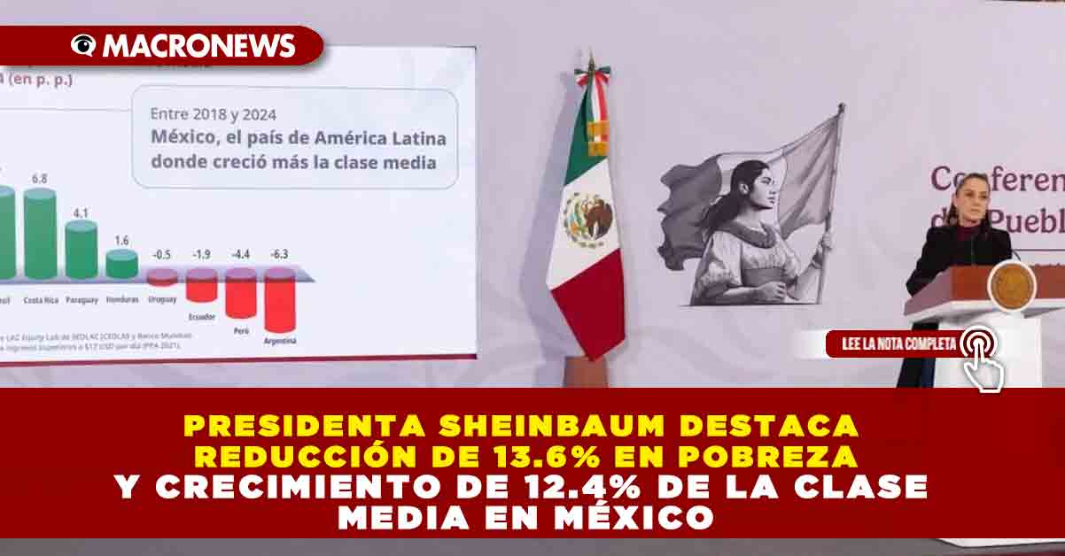 Redacción Macronews.- La presidenta de México, Claudia Sheinbaum Pardo, informó que durante los últimos siete años de la llamada cuarta transformación la población en situación de pobreza se redujo 13.6 por ciento, mientras que la clase media creció 12.4 por ciento, de acuerdo con cifras del Banco Mundial. Durante su conferencia matutina, la mandataria atribuyó estos resultados a la política de bienestar, el aumento al salario mínimo y la concepción de los programas sociales como derechos y no como apoyos asistenciales.
