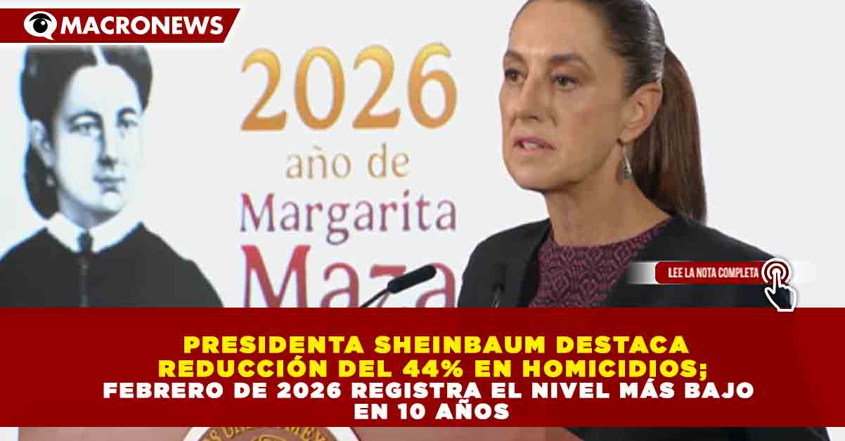 “La reducción en homicidios de septiembre de 2024 a febrero de 2026 es del 44%. Es una reducción continua mes con mes y febrero es el mes más bajo desde hace por lo menos 10 años”, expresó la presidenta.
