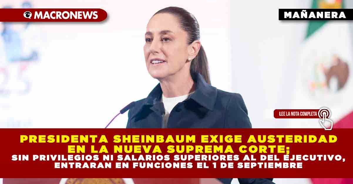 Redacción Macronews.- La presidenta de México, Claudia Sheinbaum Pardo, reiteró este lunes que los nuevos integrantes de la Suprema Corte de Justicia de la Nación (SCJN) deberán ajustarse a los principios de austeridad republicana, eliminando privilegios como bonos, seguros médicos privados y salarios superiores al del Ejecutivo federal, en cumplimiento con lo establecido en la Constitución Política de los Estados Unidos Mexicanos. La mandataria subrayó que a partir del 1 de septiembre, el Máximo Tribunal del país deberá transformarse en una institución que “viva en la justa medianía”, en consonancia con los valores del servicio público.