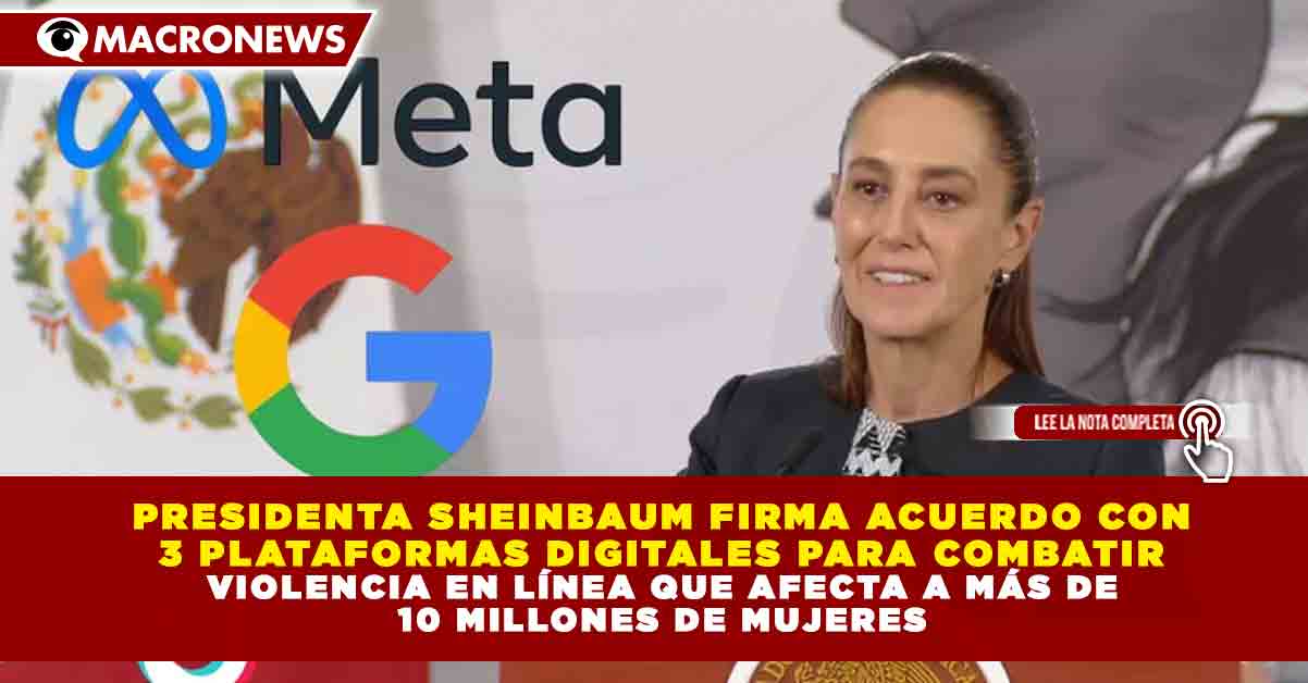 Redacción Macronews.- La presidenta de México, Claudia Sheinbaum, anunció un acuerdo sin precedentes con tres de las principales plataformas digitales del mundo para combatir la violencia en internet, problemática que en el país afecta a más de 10 millones de mujeres. El convenio fue firmado con Google, Meta y TikTok, en coordinación con la Secretaría de las Mujeres, con el objetivo de fortalecer la prevención y atención de la violencia digital.