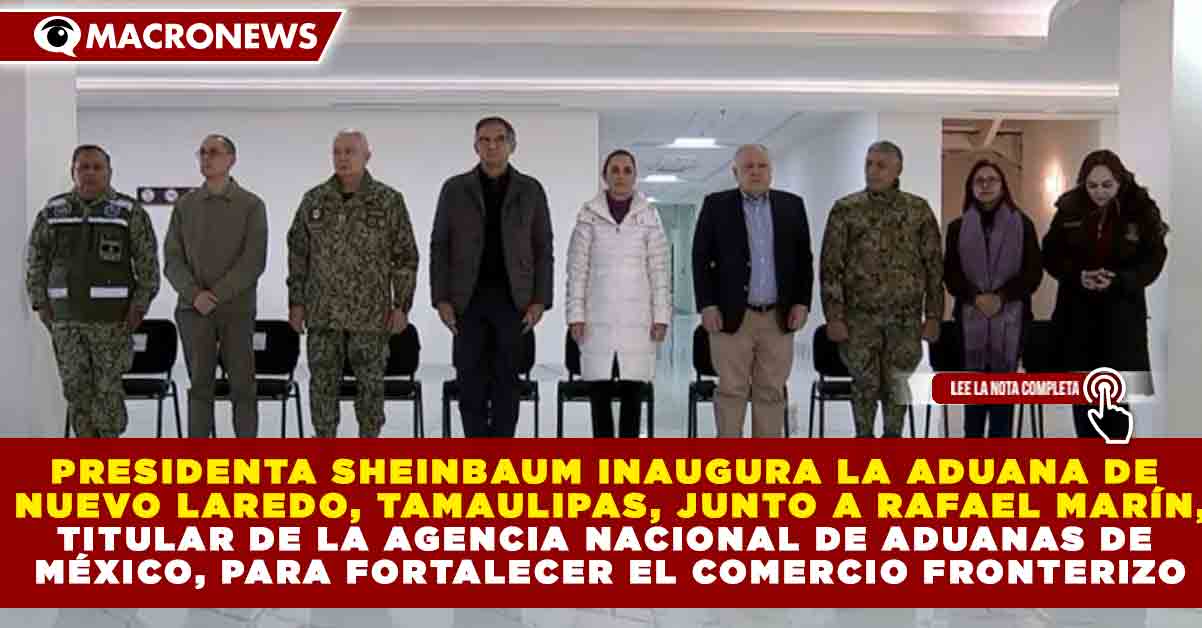 Redacción Macronews.- La presidenta de México, Claudia Sheinbaum, inauguró este domingo la nueva Aduana de Nuevo Laredo, Tamaulipas, una infraestructura estratégica que fortalece la seguridad nacional y el comercio exterior, acompañada por el gobernador Américo Villarreal y autoridades federales, en una región que aporta alrededor del 33% de la recaudación fiscal de las aduanas terrestres del país.