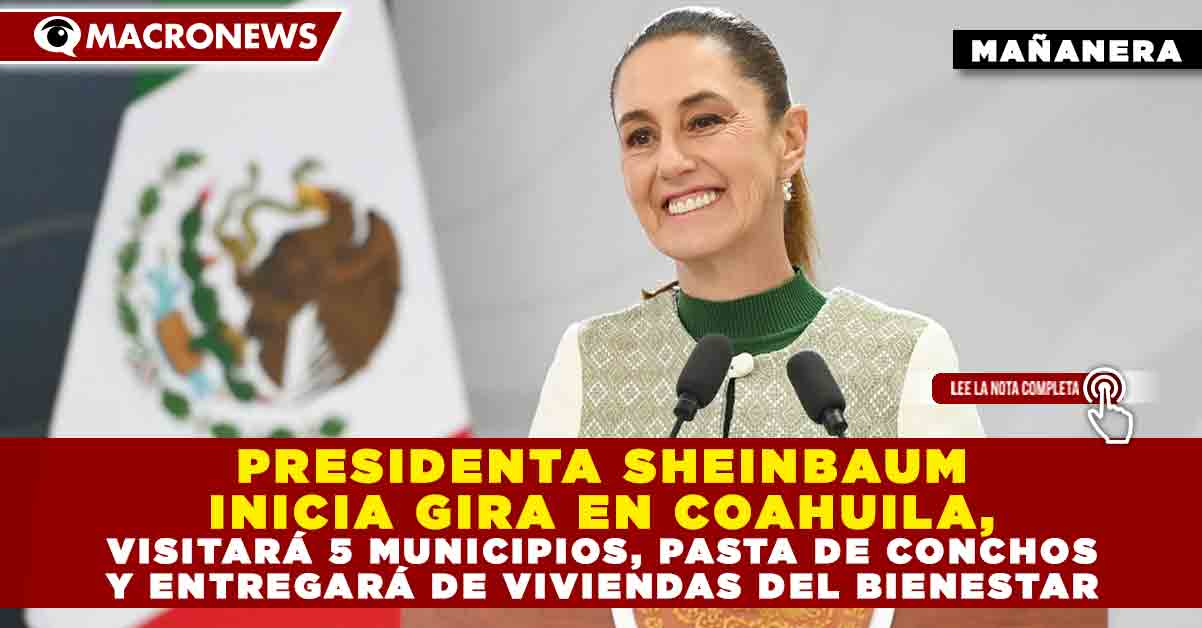 Redacción Macronews.- La presidenta de México, Claudia Sheinbaum, inició este viernes una gira de trabajo por Coahuila que contempla actividades en cinco municipios, incluyendo una visita a Pasta de Conchos en San Juan de Sabinas, con el objetivo de supervisar obras, fortalecer programas sociales y dar seguimiento a proyectos estratégicos del Gobierno de México.