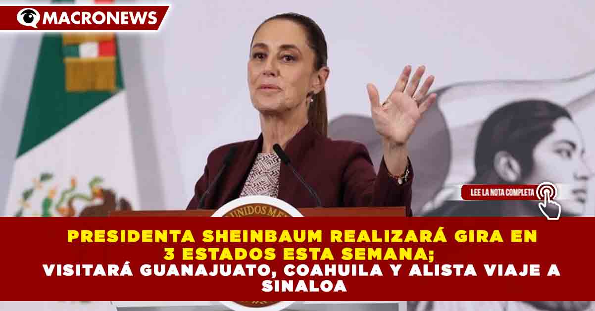 Redacción Macronews.- La presidenta de México, Claudia Sheinbaum Pardo, anunció que este fin de semana realizará una gira de trabajo por tres entidades del país, incluyendo visitas a Guanajuato y Coahuila, además de adelantar que en los próximos días contempla un recorrido por Sinaloa y Colima.