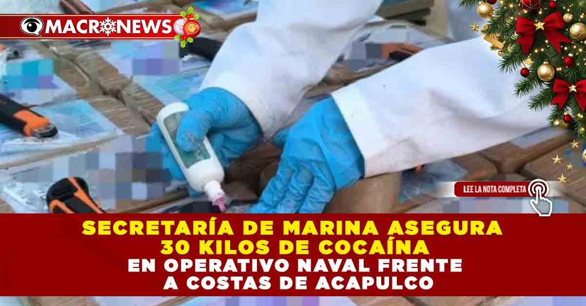 Redacción Macronews.- La Secretaría de Marina (Semar) aseguró un cargamento de 30 kilogramos de presunta cocaína frente a las costas de Acapulco, Guerrero, como parte de las acciones de vigilancia marítima realizadas por personal de la Octava Región Naval en funciones de Guardia Costera.