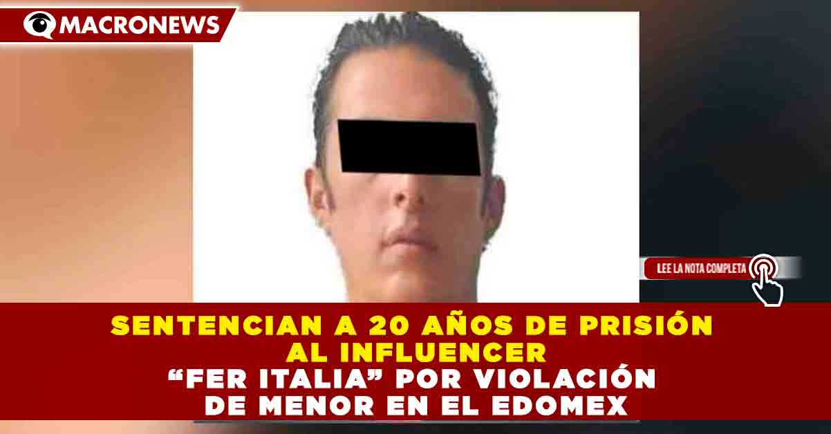 Redacción Macronews: Condenan a 20 años de prisión al influencer “Fer Italia” por violación de una adolescente en el Edomex La fiscalía de Edomex informó este miércoles que obtuvo una sentencia de 20 años de prisión contra Luis Fernando Padilla Manzo, influencer conocido como “Fer Italia”, tras acreditar su responsabilidad en el delito de violación en agravio de una adolescente de 16 años, hechos acontecidos en Huixquilucan.