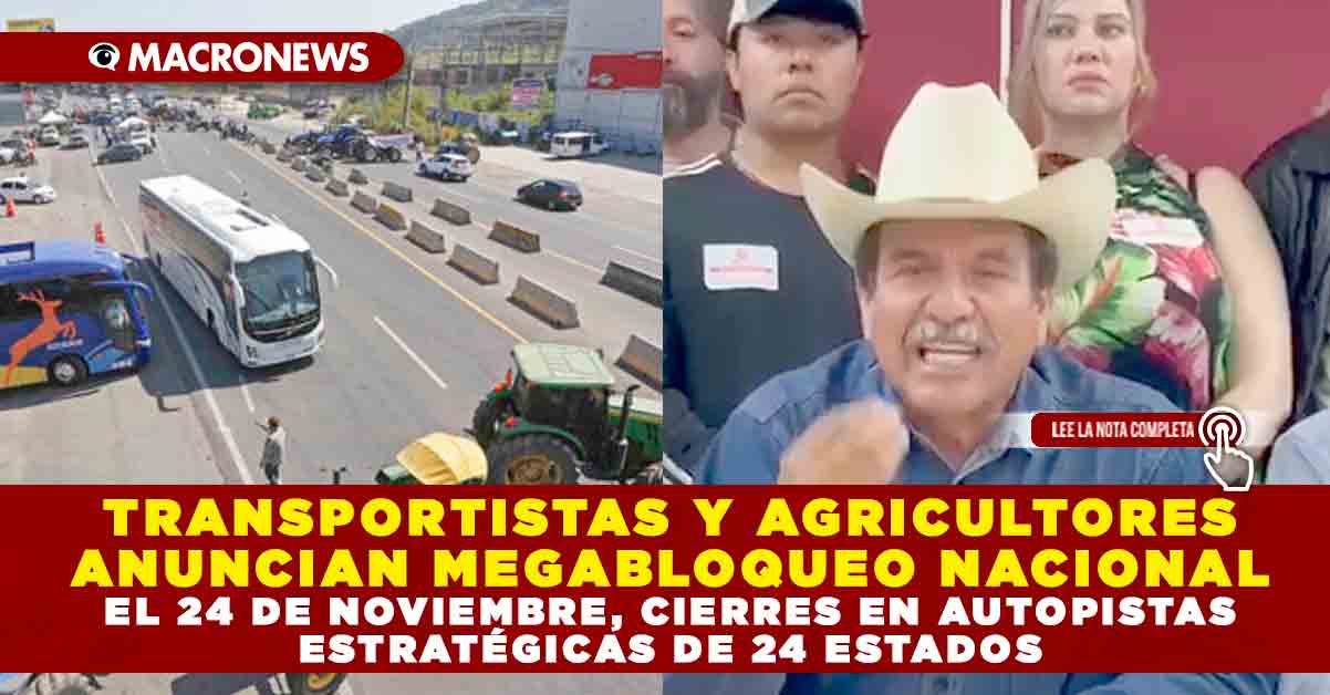 Redacción Macronews.- Agricultores y transportistas anunciaron este viernes un megabloqueo nacional para el próximo 24 de noviembre, que contempla la toma de casetas y aduanas en la frontera norte, así como cierres en autopistas estratégicas de al menos 24 entidades federativas. La Concamin advirtió que las afectaciones podrían impactar gravemente la movilidad y la cadena logística nacional, en un contexto donde las organizaciones convocantes reclaman atención a problemas de inseguridad y extorsión.