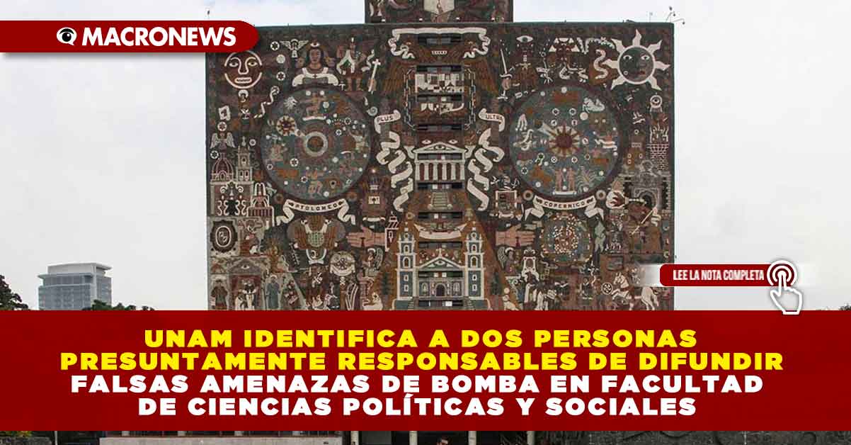 Mediante un boletín informativo, la máxima casa de estudios precisó que gracias a trabajos de investigación de la Fiscalía General de Justicia de la Ciudad de México y la Policía Cibernética, se identificó, al menos, a dos personas como las presuntamente responsables de difundir el rumor de la amenaza de bomba dentro de la Facultad de Ciencias Políticas y Sociales (FCPyS) a través de medios digitales.