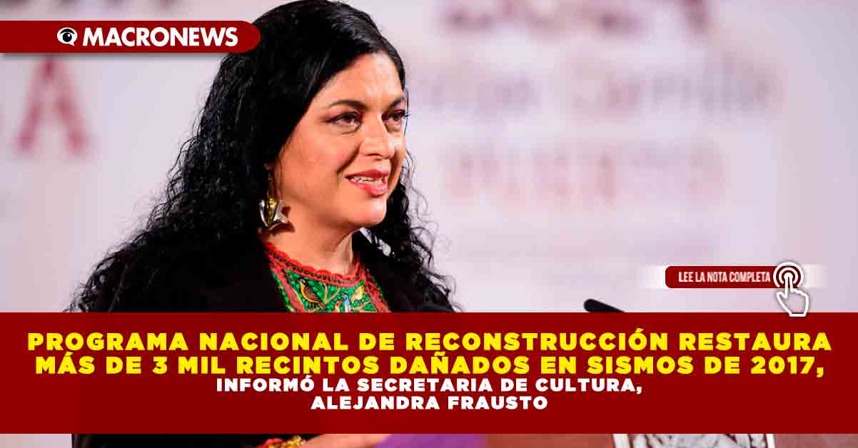 En casi seis años, el Programa Nacional de Reconstrucción ha restaurado y entregado a las comunidades 3 mil 37 inmuebles del patrimonio cultural de México dañado por los sismos del 7 y 19 septiembre de 2017, informó la secretaria de Cultura, Alejandra Frausto Guerrero.