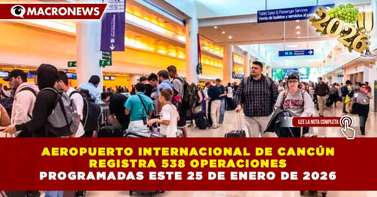 Redacción Macronews.- El Aeropuerto Internacional de Cancún reporta un total de 538 operaciones programadas para este lunes 25 de enero de 2026, distribuidas en 271 llegadas y 267 salidas. De las llegadas, 77 son nacionales y 194 internacionales, mientras que de las salidas, 77 corresponden a vuelos nacionales y 190 a vuelos internacionales.