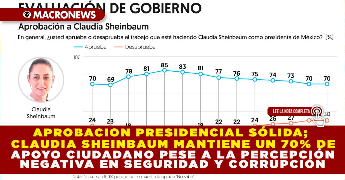 Redacción Macronews.- La presidenta Claudia Sheinbaum mantiene un nivel de aprobación ciudadana sólido, al registrar un 70 por ciento de respaldo en el mes de noviembre, de acuerdo con la más reciente encuesta nacional de El Financiero. El estudio indica que el 30 por ciento de los entrevistados desaprueba la gestión de la mandataria.
