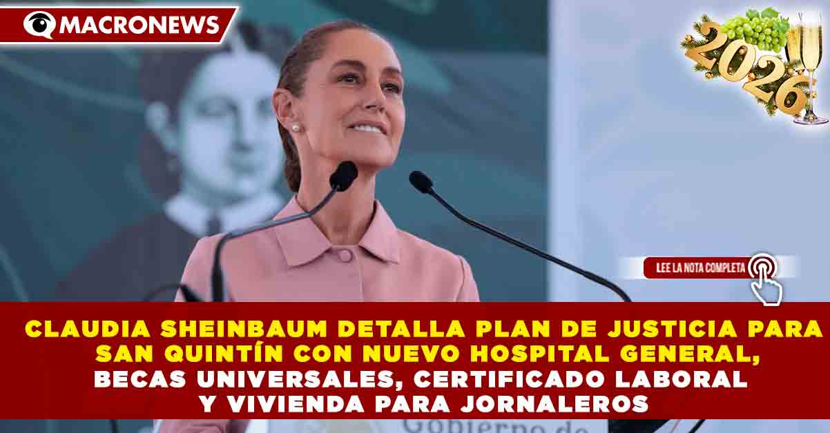 CLAUDIA SHEINBAUM DETALLA PLAN DE JUSTICIA PARA SAN QUINTÍN CON NUEVO HOSPITAL GENERAL, BECAS UNIVERSALES, CERTIFICADO LABORAL Y VIVIENDA PARA JORNALEROS