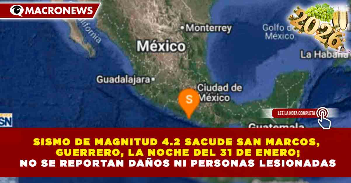 Redacción Macronews.- Un sismo de magnitud 4.2 se registró la noche del sábado 31 de enero de 2026 al suroeste del municipio de San Marcos, en el estado de Guerrero, generando inquietud momentánea entre habitantes de diversas comunidades, aunque sin dejar afectaciones materiales ni personas lesionadas, de acuerdo con reportes preliminares de las autoridades.