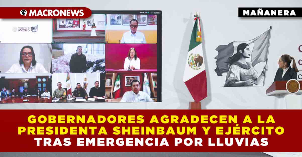 Redacción Macronews.- Gobernadores de los cinco estados afectados (Veracruz, Puebla, Hidalgo, Querétaro y San Luis Potosí) agradecieron públicamente el apoyo de la presidenta Claudia Sheinbaum y del Ejército Mexicano tras las intensas lluvias e inundaciones que afectaron a sus entidades. Durante un enlace en vivo en la conferencia matutina del 17 de octubre, los mandatarios reportaron avances significativos en la atención de la emergencia.