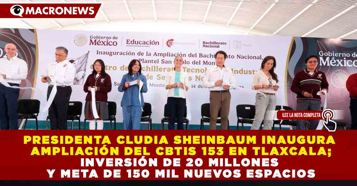 Redacción Macronews.- La presidenta de México, Claudia Sheinbaum Pardo, acompañada por la gobernadora de Tlaxcala, Lorena Cuéllar Cisneros, encabezó en San Pablo del Monte la inauguración de la ampliación del Centro de Bachillerato Tecnológico Industrial y de Servicios No. 153, obra que permitirá aumentar la matrícula a dos mil estudiantes y contribuir a la meta nacional de generar 150 mil nuevos espacios en educación media superior.