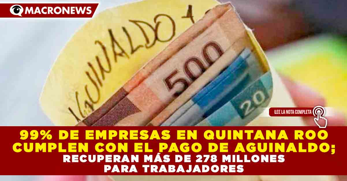 Redacción Macronews.– La Secretaría del Trabajo y Previsión Social en Quintana Roo informó que el 99% de las empresas en la entidad cumplieron con el pago del aguinaldo, lo que permitió recuperar más de 278 millones de pesos a favor de los trabajadores tras las revisiones realizadas por la autoridad laboral.