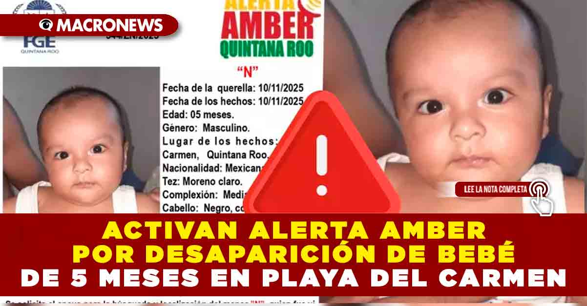 Redacción Macronews.- La Fiscalía General del Estado de Quintana Roo (FGE) activó de manera urgente el protocolo de Alerta Amber tras la desaparición de un bebé de 5 meses, identificado con la inicial “N”, ocurrida el lunes 10 de noviembre de 2025 en Playa del Carmen. Según la ficha de búsqueda oficial 344/zn/2025, se presume que el menor podría ser víctima del delito de retención y sustracción de personas menores de edad.
