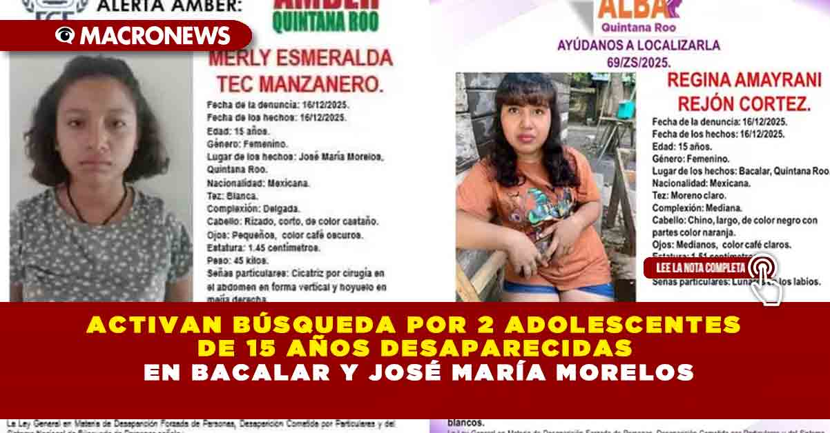 Redacción Macronews.- La Fiscalía General del Estado (FGE) de Quintana Roo activó fichas de búsqueda para localizar a dos adolescentes de 15 años reportadas como desaparecidas en municipios de la zona sur-centro del estado, tras recibir las denuncias formales de sus familiares, quienes manifestaron preocupación por la integridad de las menores.