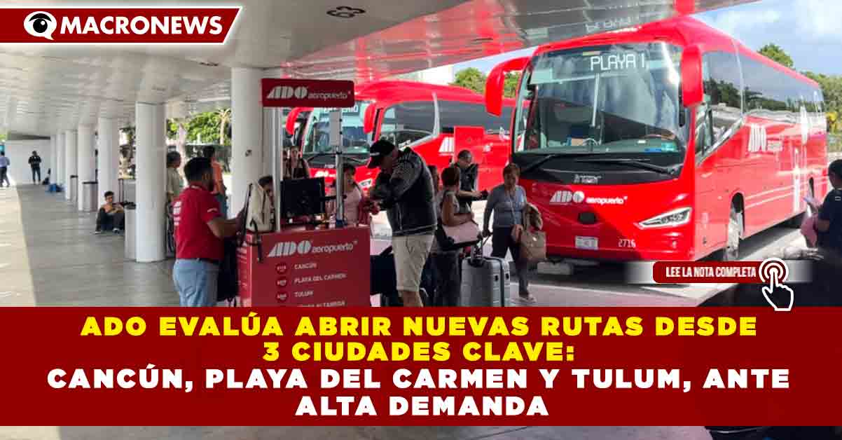 Redacción Macronews.- Ante el incremento sostenido en la movilidad de pasajeros, la empresa Autobuses de Oriente (ADO) analiza la apertura de nuevas rutas desde Cancún, Playa del Carmen y Tulum, tres de los principales polos turísticos del Caribe Mexicano, con el objetivo de atender la alta demanda registrada durante 2025 y lo que va de 2026.