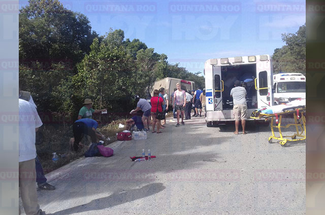 Los 31 pasajeros, viajaban a bordo de un autobús de la empresa Turismo Costa Maya, son visitantes de Mahahual que arribaron en el crucero Royal Caribbean con destino a la zona arqueológica de Chaccobén.