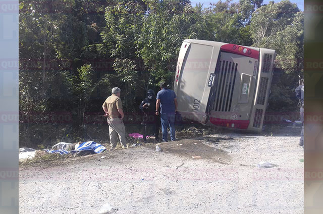 Un autobús turístico volcó en la carretera Cafetal- Mahahual, aún por causas desconocidas, dejando como saldo al menos 12 personas muertas y varios lesionados, de acuerdo con los últimos reportes.