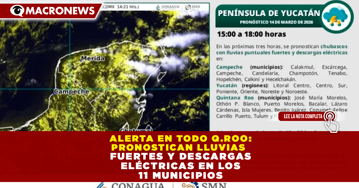 QUINTANA ROO. – El Servicio Meteorológico Nacional (SMN) ha emitido un aviso urgente de corto plazo para la tarde de este sábado. Se esperan chubascos con lluvias puntuales fuertes y actividad eléctrica que afectarán de norte a sur la geografía estatal. Ante la saturación de suelos por las lluvias previas, el riesgo de encharcamientos e inundaciones es elevado en zonas urbanas y carreteras.
