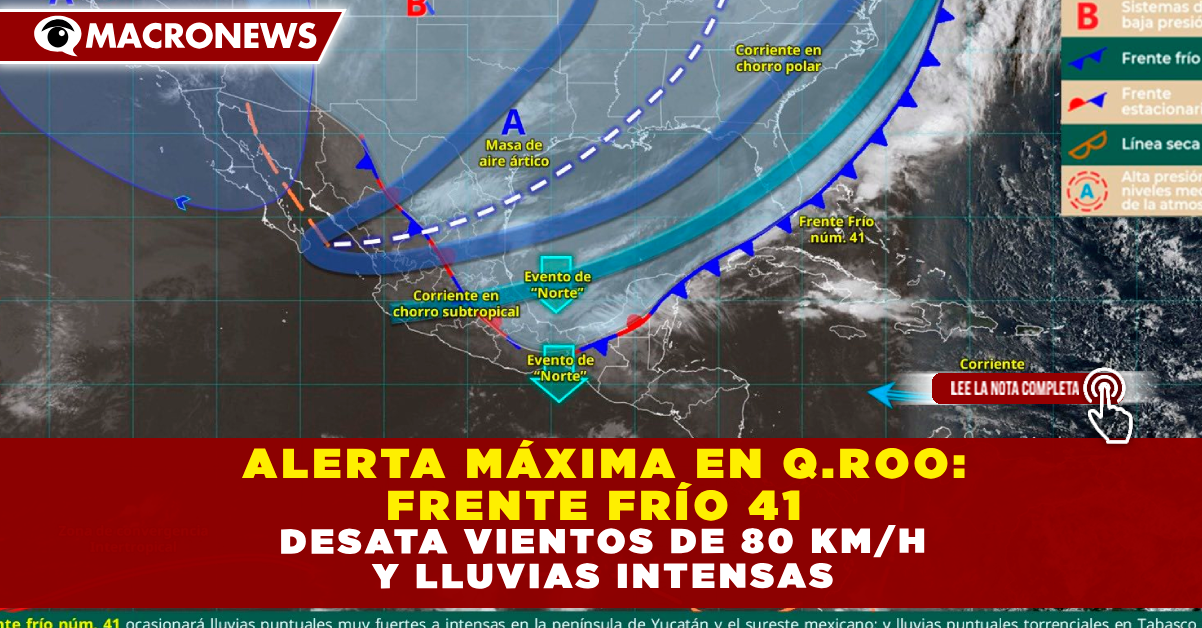 CANCÚN, Q. ROO. – La Coordinación Estatal de Protección Civil y la Conagua han emitido un aviso urgente debido a los efectos severos del frente frío núm. 41. Se pronostican lluvias puntuales muy fuertes a intensas acompañadas de descargas eléctricas en gran parte del estado. Sin embargo, la mayor preocupación radica en el evento de “Norte” muy fuerte, con ráfagas de viento que alcanzarán los 80 km/h, afectando principalmente la zona norte de Quintana Roo y provocando un oleaje peligroso en sus costas.