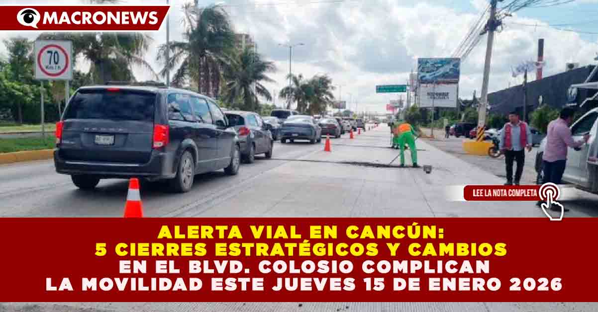 Redacción Macronews.- La ciudad de Cancún enfrenta una jornada de movilidad compleja este jueves 15 de enero de 2026, debido a la ejecución simultánea de obras de infraestructura y mantenimiento en arterias de alto flujo vehicular. Las autoridades locales han confirmado la vigencia de cinco cierres viales principales, además de modificaciones críticas en la circulación del Boulevard Colosio. Estos proyectos, destinados a la modernización urbana y la optimización de servicios básicos, han generado una reducción de hasta el 40% en la velocidad promedio de desplazamiento en las zonas afectadas durante las horas pico, por lo que se exhorta a la ciudadanía a extremar precauciones.