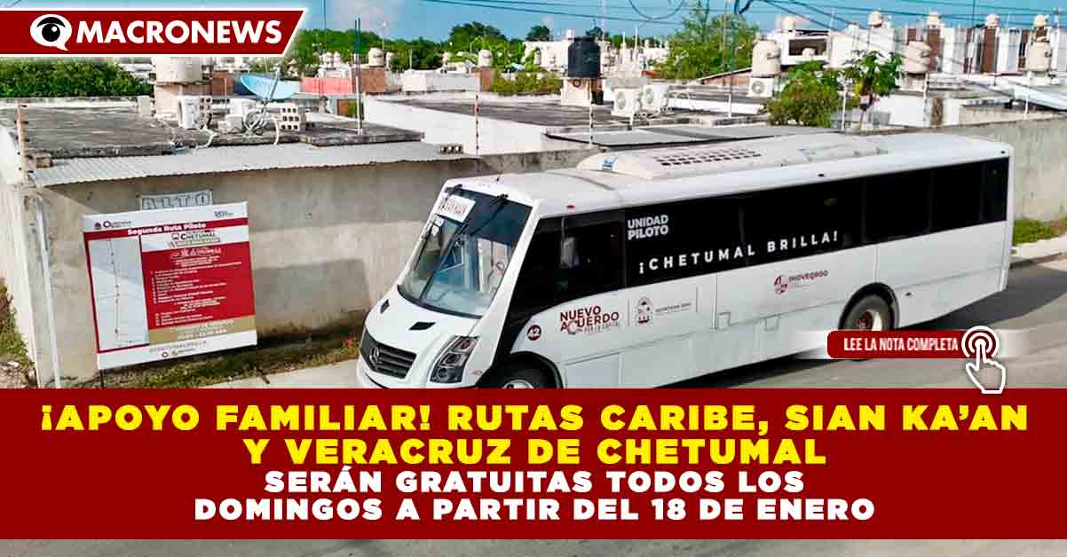 Redacción Macronews por Santiago Ramírez.-A partir del próximo 18 de enero, el transporte público del sistema Tu Ruta Chetumal será gratuito todos los domingos, como una medida temporal impulsada por autoridades estatales para fomentar la convivencia familiar, el uso del transporte público y el disfrute de los espacios urbanos en la capital de Quintana Roo.