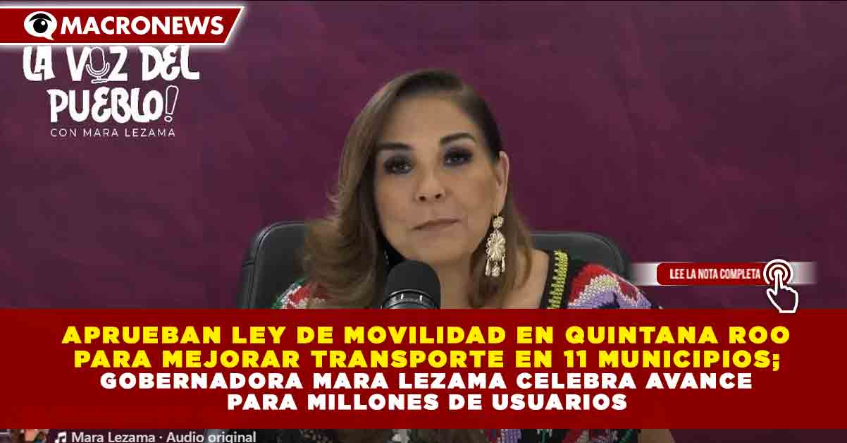 Redacción Macronews.- La gobernadora de Quintana Roo, Mara Lezama Espinosa, celebró la aprobación de la nueva Ley de Movilidad del estado, una iniciativa que busca transformar el sistema de transporte público y mejorar la movilidad para millones de habitantes y visitantes en los 11 municipios de la entidad.