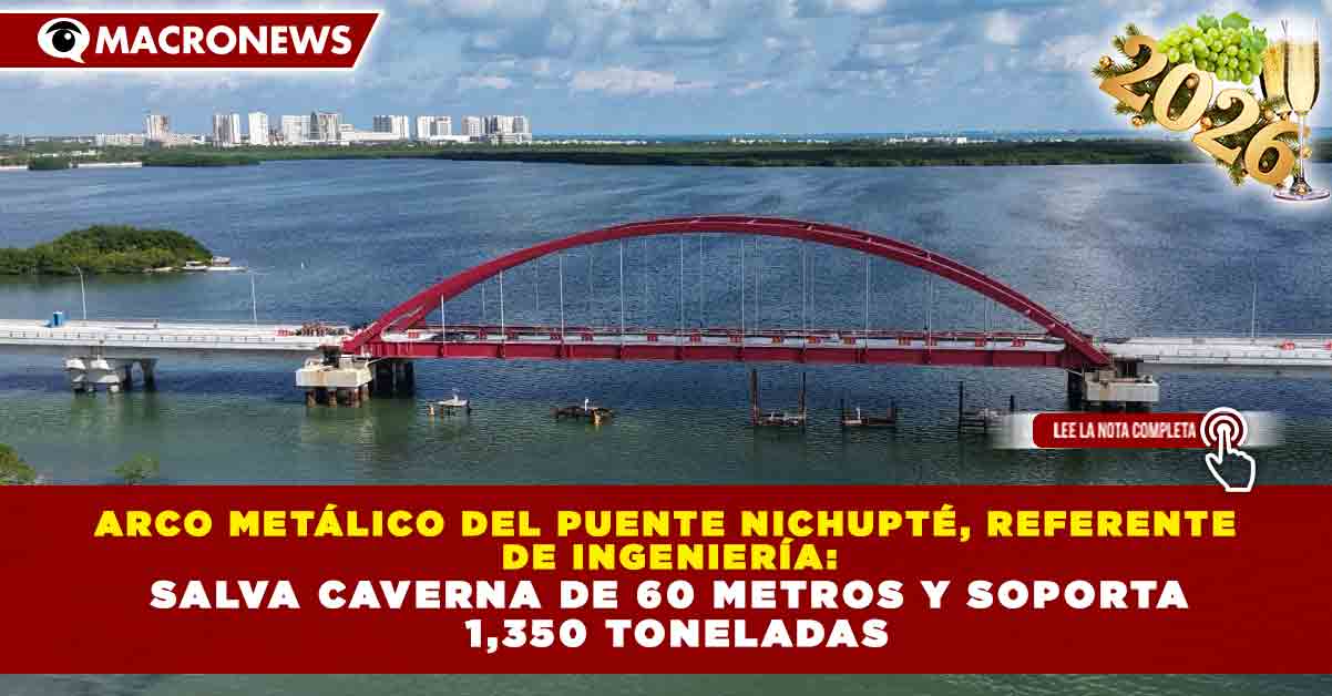 Redacción Macronews.- El Arco Metálico del Puente Vehicular Nichupté se consolida como un referente de ingeniería especializada en México, al ser diseñado para salvar una caverna subacuática de 60 metros de diámetro y 70 metros de profundidad, mediante una estructura de 103 metros de longitud y 18.5 metros de altura, apoyada únicamente en sus extremos para evitar cualquier intervención directa sobre la oquedad.
