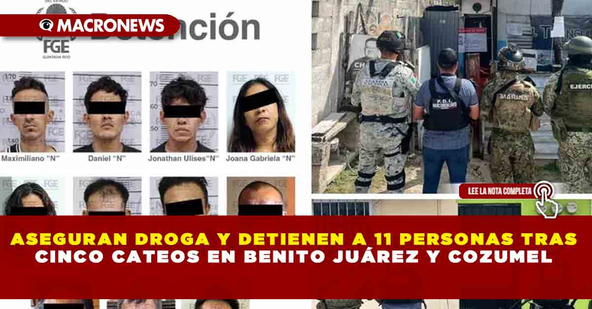 La Fiscalía General del Estado (FGE) de Quintana Roo informó sobre la detención de 11 personas y el aseguramiento de diversas dosis de narcóticos durante cinco cateos ejecutados en los municipios de Benito Juárez y Cozumel.