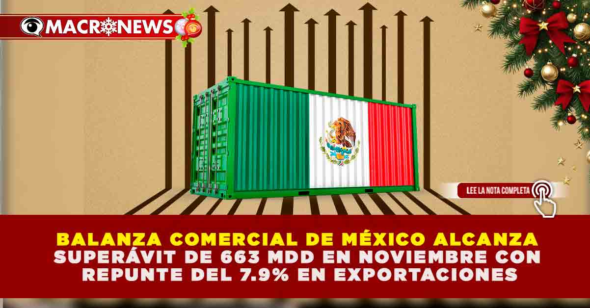 BALANZA COMERCIAL DE MÉXICO ALCANZA SUPERÁVIT DE 663 MDD EN NOVIEMBRE CON REPUNTE DEL 7.9% EN EXPORTACIONES