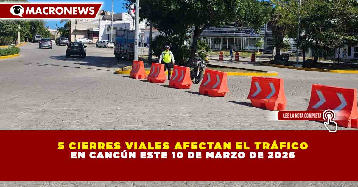 Redacción Macronews.- Este martes 10 de marzo de 2026, al menos 5 cierres viales y restricciones de carriles se mantienen en distintos puntos de Cancún debido a trabajos de reparación y obras en la vía pública, situación que podría generar congestionamiento vehicular en varias zonas de la ciudad.