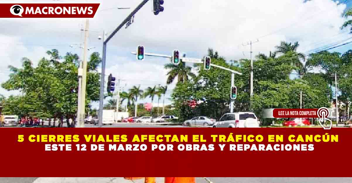 Redacción Macronews.- Autoridades informaron que al menos cinco puntos de Cancún presentan cierres viales y restricciones de circulación este jueves 12 de marzo de 2026, debido a trabajos de reparación y obras en distintas avenidas de la ciudad, lo que podría generar afectaciones en el tránsito vehicular.