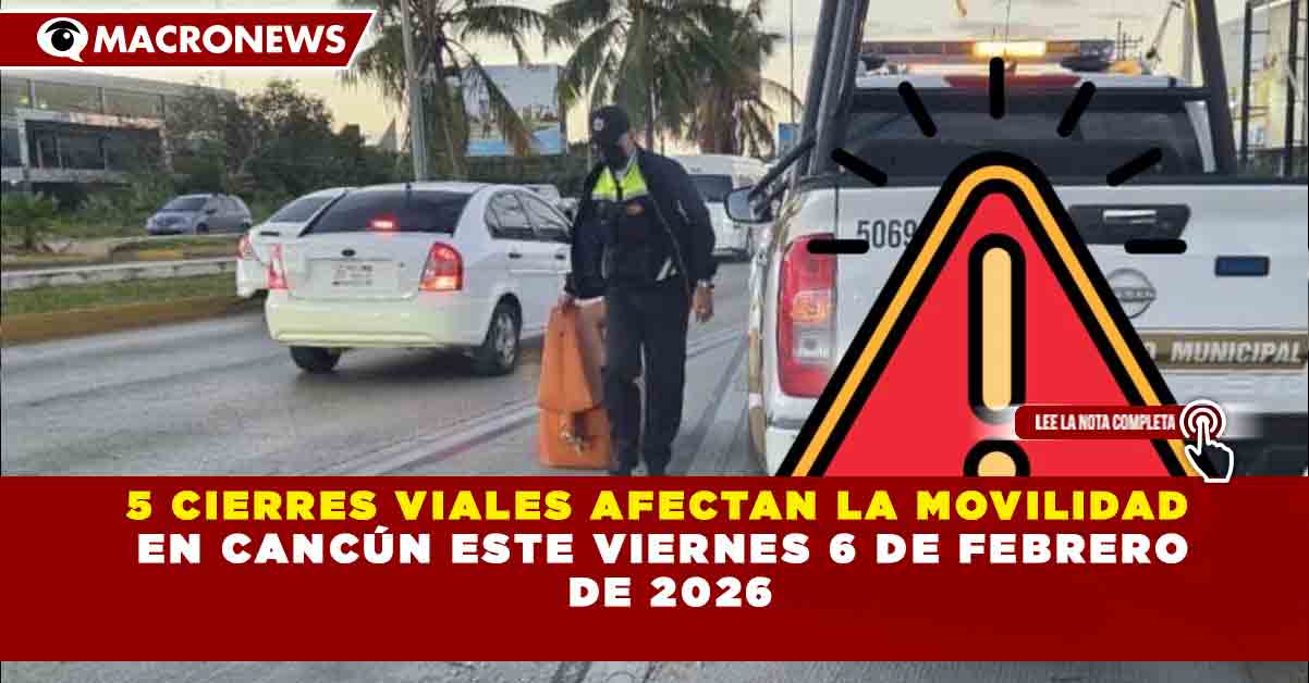 Redacción Macronews.- Autoridades municipales informaron sobre las condiciones viales en Cancún para este viernes 6 de febrero de 2026, día en el que se mantienen cinco cierres y confinamientos viales derivados principalmente de trabajos de reparación y reencarpetamiento, por lo que se exhorta a la ciudadanía a tomar precauciones y salir con anticipación para evitar contratiempos.