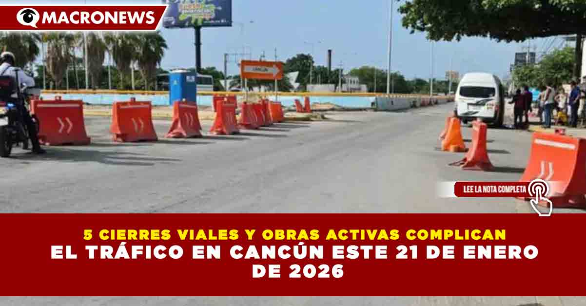 Redacción Macronews.- Si vas a salir de casa o te diriges a tu zona de trabajo, es importante tomar precauciones, ya que este miércoles 21 de enero el tráfico en Cancún presenta complicaciones por al menos cinco cierres viales y carriles confinados, principalmente en avenidas de alto flujo como el Boulevard Colosio y la Avenida Kabah, debido a obras del Puente Nichupté y trabajos de rehabilitación urbana.
