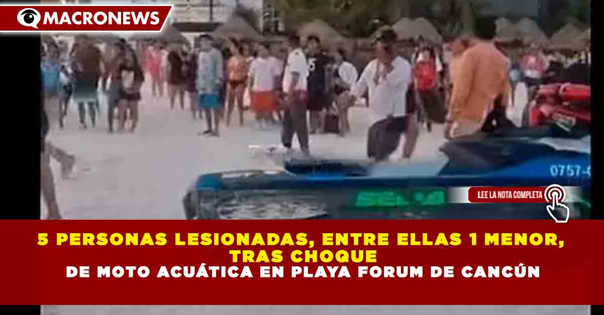 Redacción Macronews.- Un total de cinco personas lesionadas, incluida una menor de edad, dejó un accidente ocurrido en Playa Forum, en la zona hotelera de Cancún, luego de que una moto acuática presuntamente fuera de control embistiera a bañistas que se encontraban en la orilla del mar.