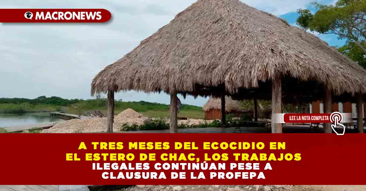 A tres meses de la denuncia por el ecocidio del estero de Chac, el desafío a las autoridades federales y el daño continúan, debido a que los trabajos no se detienen. Alrededor de las palapas clausuradas se puede observar pasto recién sembrado para ocultar el relleno con sascab del área de humedales y de lo cual tomó nota en su inspección la Procuraduría Federal de Protección al Ambiente (Profepa).