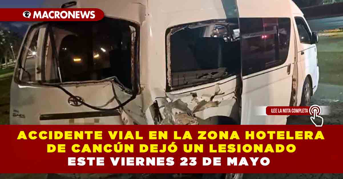 Un accidente de tránsito se registró la mañana de este viernes 23 de mayo de 2025, alrededor de las 05:09 horas, en el kilómetro 6 del boulevard Kukulcán, en plena zona hotelera de Cancún, dejando como saldo una persona lesionada.