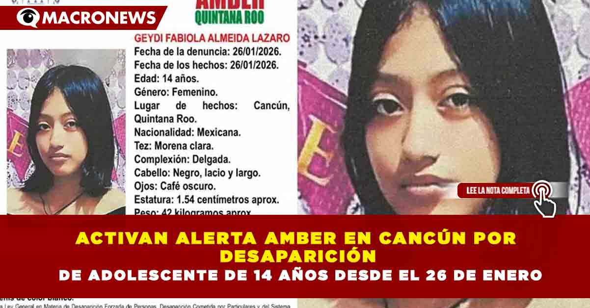 Redacción Macronews.- La Fiscalía General del Estado de Quintana Roo activó una Alerta Amber para localizar a Geydi Fabiola Almeida Lázaro, adolescente de 14 años, quien fue reportada como persona no localizada en la ciudad de Cancún desde el 26 de enero de 2026, fecha en la que se presentó la denuncia correspondiente.