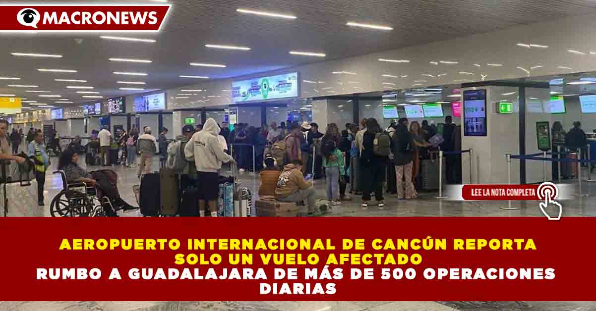 Redacción Macronews.- El Aeropuerto Internacional de Cancún informó que únicamente un vuelo con destino a Guadalajara presentó afectaciones, mientras el resto de las operaciones programadas se desarrollan con normalidad, en una jornada que supera las 500 operaciones aéreas.