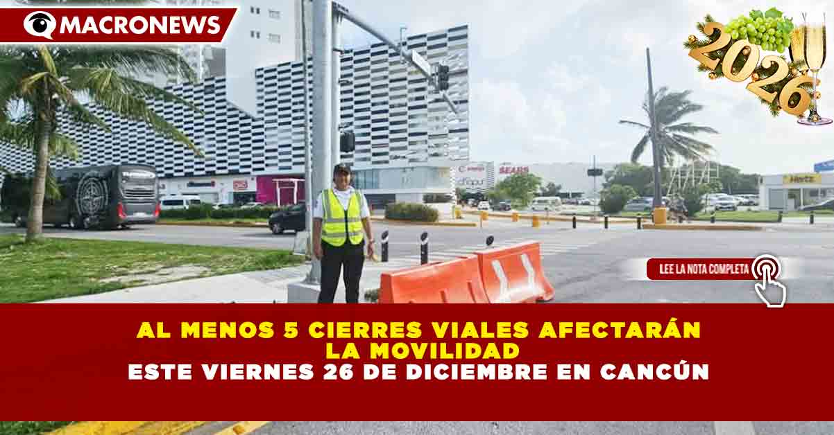 Redacción Macronews.- Autoridades de tránsito informaron que este viernes 26 de diciembre se mantendrán diversos cierres viales y restricciones parciales en distintos puntos de Cancún, como parte de trabajos urbanos, operativos preventivos y ajustes a la circulación tras el periodo vacacional, lo que podría generar demoras de hasta 30% en los tiempos de traslado en horas pico.