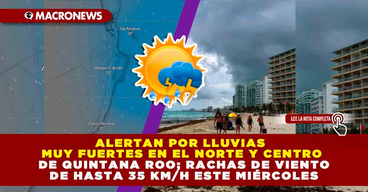 ALERTAN POR LLUVIAS MUY FUERTES EN EL NORTE Y CENTRO DE QUINTANA ROO; RACHAS DE VIENTO DE HASTA 35 KM/H ESTE MIÉRCOLES