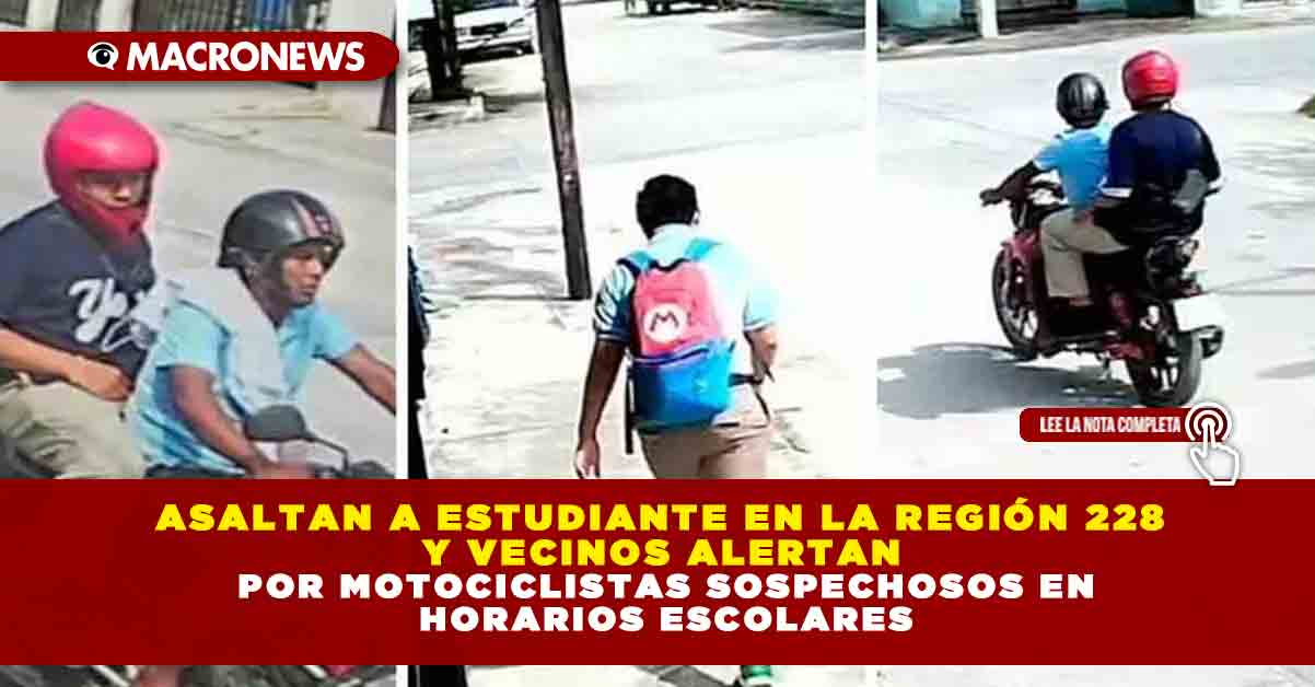 Durante la tarde del miércoles 19 de noviembre, un estudiante de secundaria fue víctima de un asalto cometido por dos sujetos que se desplazaban en una motocicleta, hecho que ha generado preocupación entre los vecinos de la Región 228 de Cancún. Habitantes de la zona aseguran haber visto a los mismos individuos merodeando días antes, lo que incrementa la alerta entre la comunidad.
