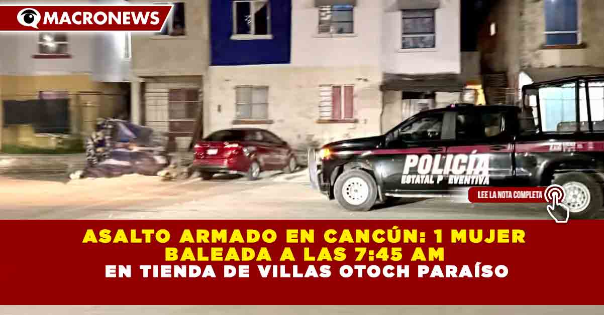 Redacción Macronews.- Durante las primeras horas de este viernes 23 de enero, se registró un asalto a mano armada en la supermanzana 259 de Cancún que dejó como saldo a una mujer lesionada por proyectil de arma de fuego, luego de ser atacada dentro de una tienda de abarrotes del fraccionamiento Villas Otoch Paraíso.