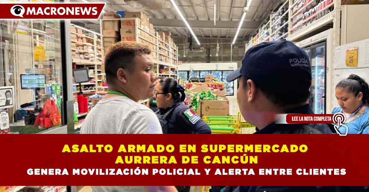 Redacción Macronews.- Un asalto armado registrado la noche de este martes en un supermercado Bodega Aurrerá de Cancún provocó una intensa movilización de cuerpos de seguridad, luego de que sujetos armados irrumpieran en el establecimiento y perpetraran el robo en cuestión de minutos, sin que hasta el momento se reporten personas lesionadas.