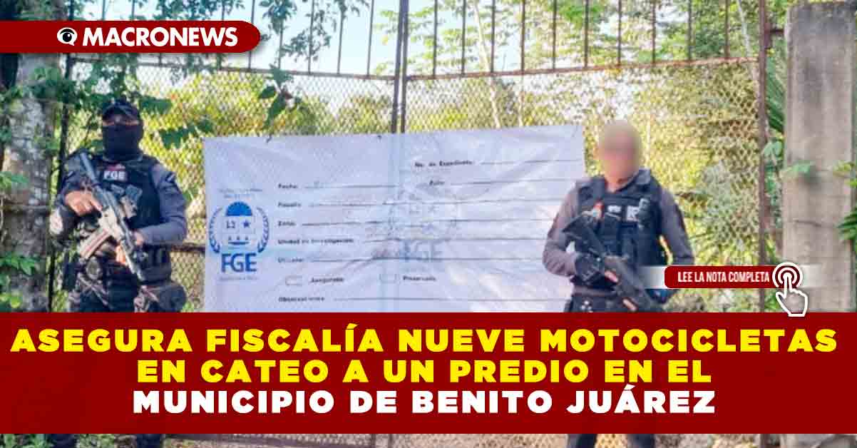 Benito Juárez.– Como resultado del cumplimiento de una orden de cateo otorgado por un Juez de Control en un predio ubicado en la zona agropecuaria de la colonia Sac Nicté en este municipio, la Fiscalía General del Estado aseguró nueve motocicletas y un motor que fueron puestos a disposición de la autoridad correspondiente para el trámite legal respectivo.